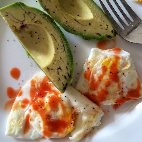 2 fried eggs topped with a ton of hot sauce, coffee with half and half, and 1/2 an avocado with lots of salt. I never realized how awesome the smell of frying things in butter was before this detox. It's HEAVENLY.